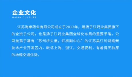 揚(yáng)子江藥業(yè)集團(tuán)江蘇海岸藥業(yè)有限公司成立于2012年10月,是揚(yáng)子江藥業(yè)集團(tuán)全球化布局的重要手筆。公司注冊(cè)資本1.5億元,總投資15億元,占地376畝,規(guī)劃建設(shè)總面積17萬(wàn)平方米,是一家大型綜合性制藥企業(yè),公司現(xiàn)有六大職能部門,五大業(yè)務(wù)部門,在冊(cè)員工250余人,其中專業(yè)技術(shù)人員達(dá)90%以上。公司坐落于著有“蘇州橋頭堡,虹橋副中心”的江蘇吳江汾湖高新技術(shù)產(chǎn)業(yè)開(kāi)發(fā)區(qū)內(nèi),毗鄰上海、浙江,交通便利,有著得天獨(dú)厚的地理交通優(yōu)勢(shì)。